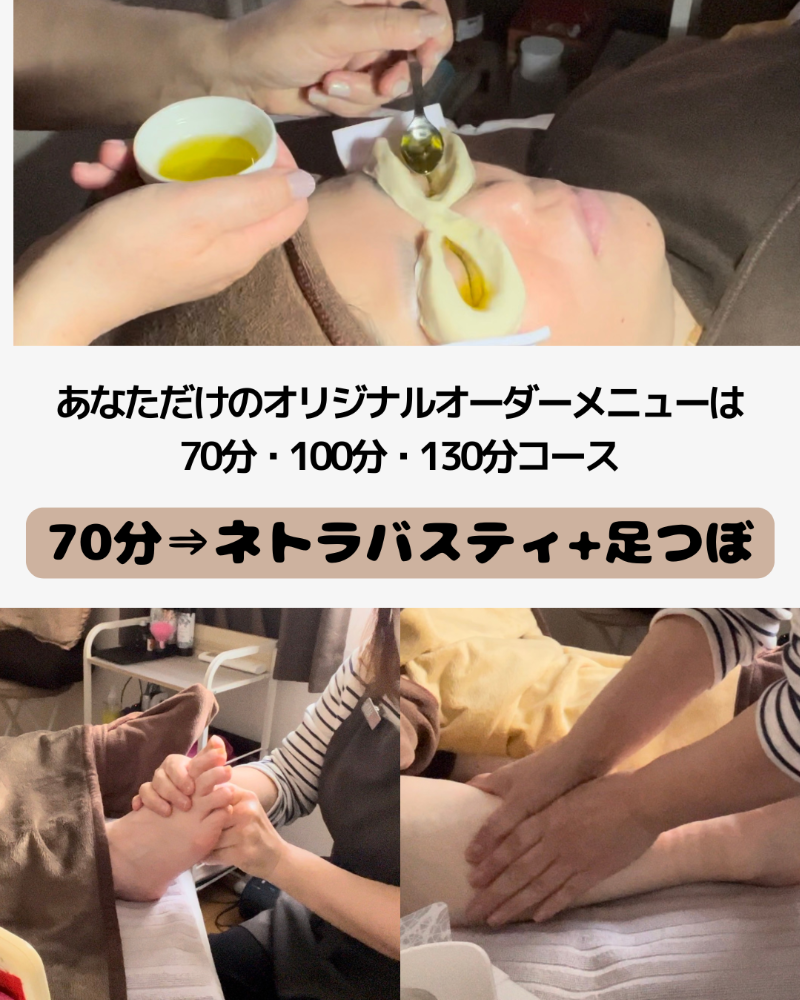 | B.オリジナル メニュー (70分) 7,700円 | ✤ネトラバスティ+足つぼリフレ✤ |