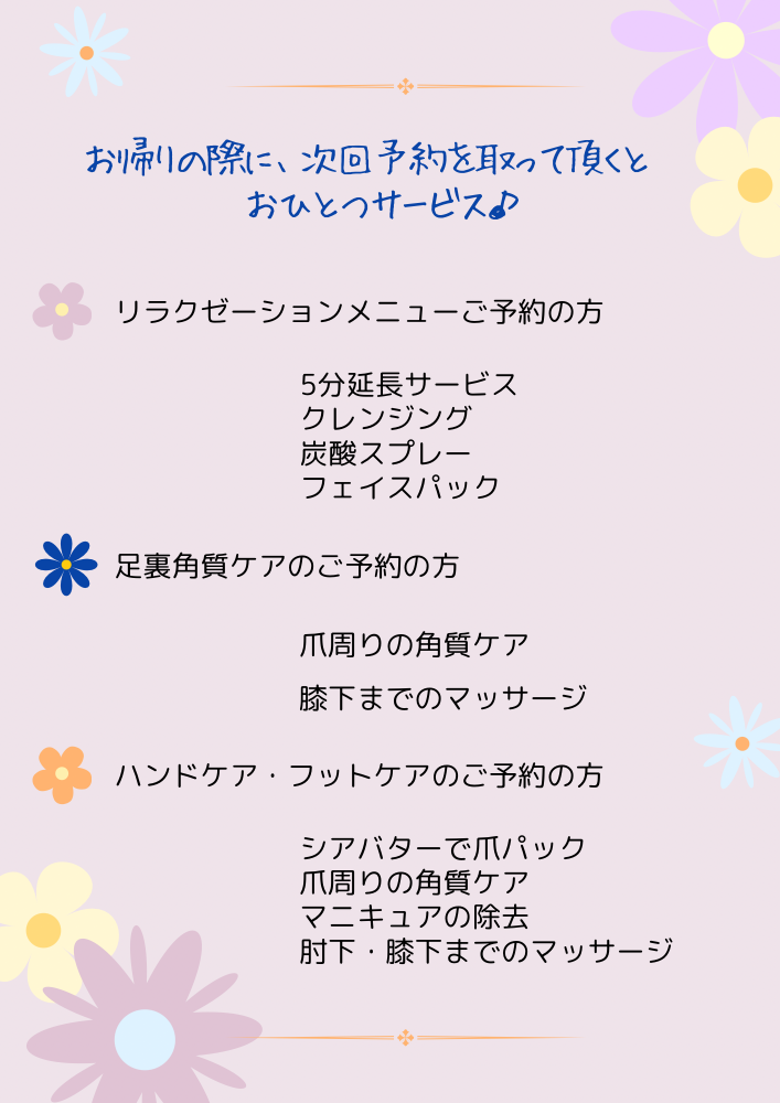 | 妊婦さんの フットケア (足爪のお手入れ) 6000円 | 足爪のカットと 爪周りのお手入れ♪ 6,600円⇒6,000円(割引不可) |